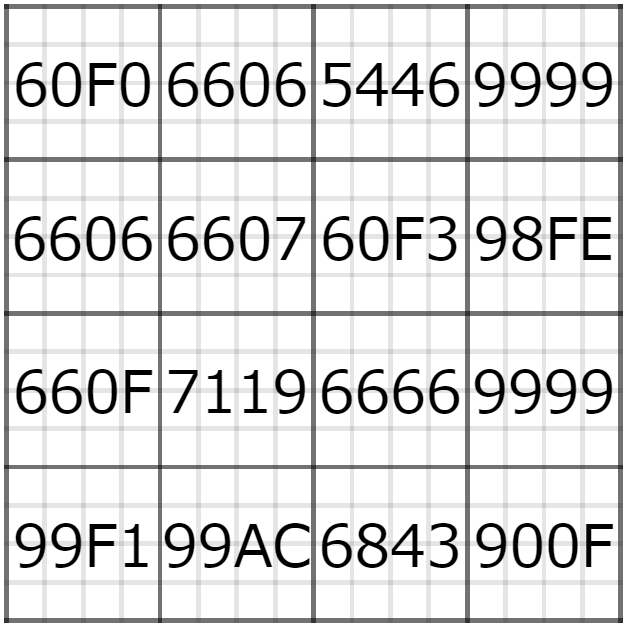 各漢字をunicodeの4桁の値を16桁の2進数で表記して、4×4のマス目に左上から右下にむけて埋めてみましょう。